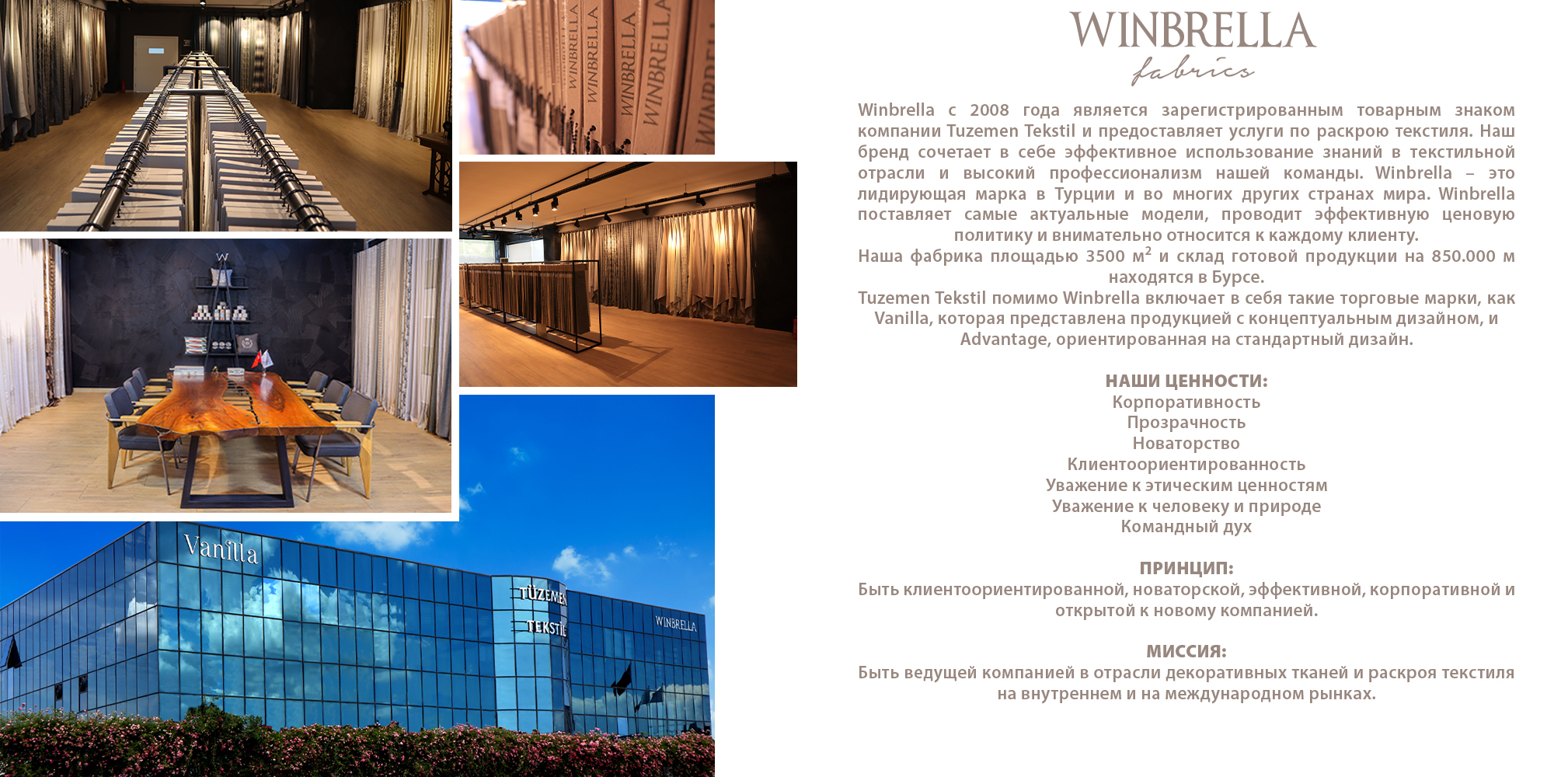 Vanilla - это бренд домашнего текстиля, в котором сочетаются знания и опыт Tuzemen Tekstil и профессионализм команды экспертов в своей области. Продукция бренда производится в соответствии с высоким качеством и тщательно упаковывается на последнем этапе производства. Кроме этого бренд включает в себя многочисленную продукцию для различных областей, не ограничиваясь только шторным текстилем.